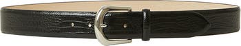 A glossy buckle elevates a versatile belt rendered in croc-embossed leather for eye-catching texture.