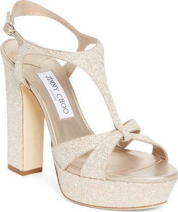 Stand out in this glitter-encrusted sandal designed in a T-strap silhouette lofted skyward by a chunky platform and block heel.