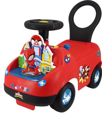 Ride-on plays sounds and has flashing lights! Slide gearshift to see Spidey move forward and back in his neighborhood! Interactive dashboard with electronic activities features a revving engine and other fun sounds Safe and durable construction for hours of riding fun.