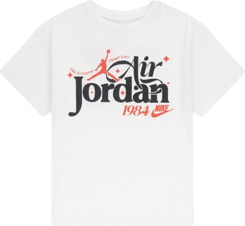 Cotton-rich jersey keeps kids comfy from the classroom to the couch in this tagless T-shirt featuring 80s throwback graphics and Jumpman iconography, inspiring young hoopsters to shoot for the stars.