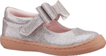 A charming bow adorns the mary jane strap on a play-ready flat featuring a foam-cushioned footbed and slip-resistant rubber sole.