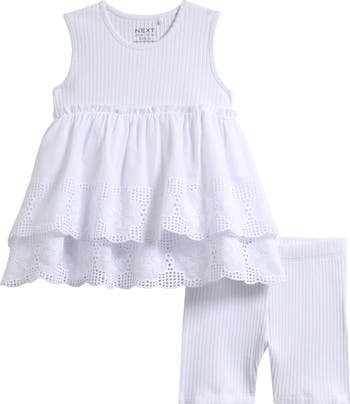 Scalloped edges further the sweetness of the babydoll tank in this summery cotton-blend set complete with comfy ribbed shorts.