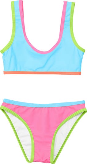 They ll be ready to make a splash in this chlorine-resistant two-piece swimsuit comprised of a colorblocked top and matching bottoms.