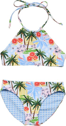 They ll love the reversible design of this two-piece swimsuit featuring a halter bikini top and hipster bottoms.