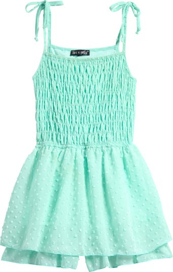 This clip-dot romper with a smocked bodice, tied straps and a skirted overlay is perfect for warmer-weather occasions.