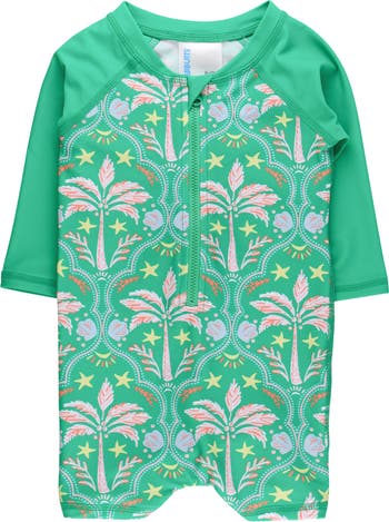 Watch your favorite little one splash and play in this one-piece swimsuit featuring colorblocked raglan sleeves that block out the sun, sand and surf.