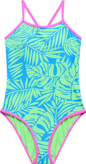 They ll love lounging poolside in this ribbed one-piece swimsuit featuring crisscross straps, contrast binding and a stretchy fit.