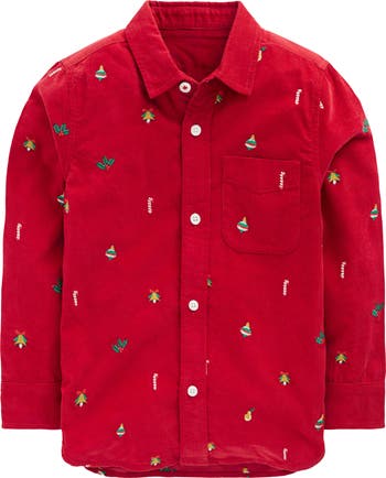 Your kid can get into the holiday spirit with this corduroy button-up shirt embroidered with charming Christmas designs.