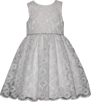 Floral embroidery gives the mesh overlay of this party dress a lacy look that pairs perfectly with sparkly details and a flared skirt that s perfect for your favorite partygoer s next big event.