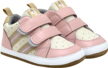 A split rubber sole adds enhanced traction to this soft leather sneaker made especially for beginning walkers with easy-on adjustable straps. A cushioned footbed provides protection, comfort and flexibilty for healthy foot development.