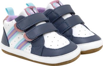 A split rubber sole adds enhanced traction to this soft leather sneaker made especially for beginning walkers with easy-on adjustable straps. A cushioned footbed provides protection, comfort and flexibilty for healthy foot development.