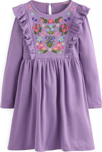 Garden blooms are embroidered on the bodice of a roomy cotton-jersey dress that s framed by perky ruffles.