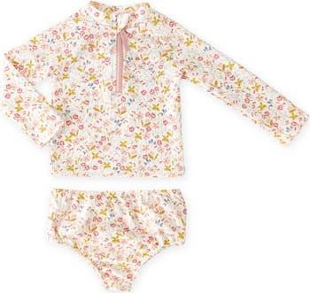 Keep your little one protected on sunny days splashing in the water with this two-piece swimsuit made from UPF 50+ fabric that pairs a long-sleeve rashguard with bloomer bottoms that allow plenty of room for a swim diaper.