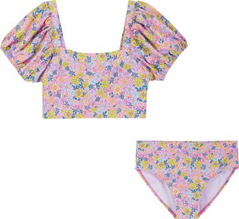 Let them splash and play in this printed two-piece swimsuit designed with a puff-sleeve top and matching bottoms.