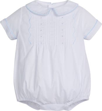 Our Francis Bubble is a darling, delicate white bubble with an Eaton collar and light blue contrast binding. The center chest features classic pin-tucks with light blue embroidery. Your baby boy will look picture-perfect for any occasion!