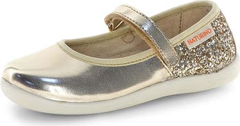 A dash of glitter adds even more shine to this metallic mary jane secured with an adjustable hook-and-loop strap to give your kiddo a custom fit.