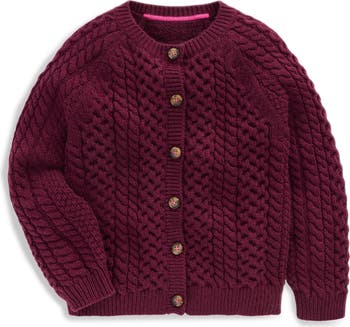 Mixed cable stitches create a delightful pattern on a button-front cardigan that keeps your youngster as cozy as can be.