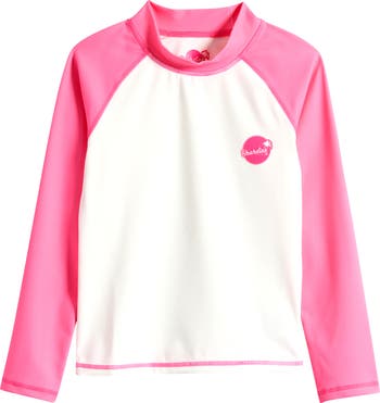 Stretchy, UV-blocking fabric extends your child s fun in the sun and surf in this raglan-sleeve rashguard that breathes easy and dries quickly for on-land comfort.