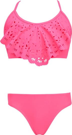 A laser-cut overlay brings playful energy to this two-piece swimsuit that ll keep them splashing happily all day long.