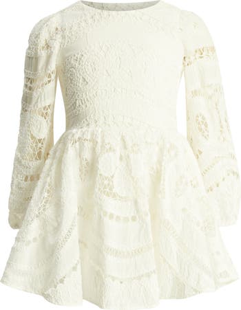 Gorgeous lace detailing lends lots of texture to this precious kid-sized party dress framed by voluminous long sleeves and designed with a flared skirt.