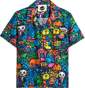 Little-known but friendly looking jungle critters are everywhere on this bright and lightweight button-up sport shirt.