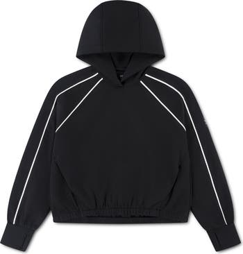 This hooded pullover made from the brand s lightweight and stretchy NeoKnit scuba fabric is made with sporty lines of piping at the raglan sleeves and elastic to cinch in the hem.