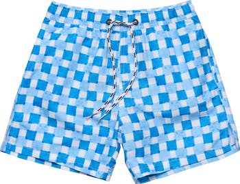 A vacation-ready grid patterns these surf-ready board shorts with an elastic waist for kid-approved comfort.