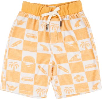 A checkerboard of fun under the sun covers French terry shorts made with an elastic waist for play-all-day comfort.