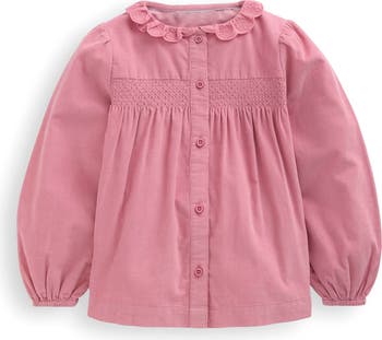 A perky scalloped collar tops a button-up shirt made from soft cotton corduroy and sweetly accented with smocking on the bodice.