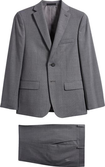 Heathered-grey coloring patterned a pale windowpane check keeps your child looking dapper at any formal occasion in a two-piece suit that s crafted with a touch of stretch for easy-wearing comfort. The skinny tailoring and flat-front trousers add timeless detailing to the crisp, polished finish.