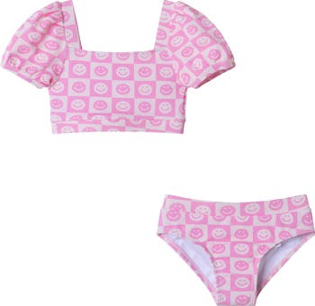 Pretty puff sleeves lend a little extra sun protection to this textured two-piece swimsuit with a playful smiley print they ll love.