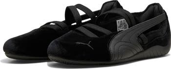 An extended topline bridged with bands of soft elastic complement the ballet-inspired detailing of a velvet-wrapped sneaker that s sized for kids and designed with details from its origins as a racining shoe. A curvy Formstrip floating against the open side and a PUMA Cat embroidered on the toe keep the pedal to the floor for a fan-favorite win.