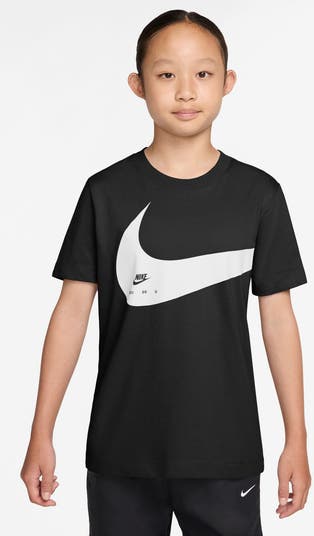 The bold Swoosh cannot be contained on the front of this all-cotton T-shirt, so it wraps around to the back.