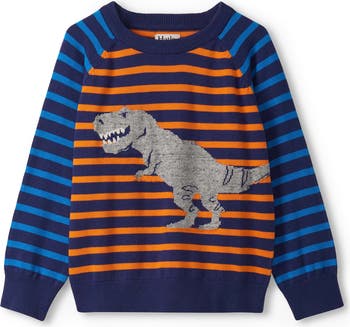 A fearsome intarsia T-Rex thunders across this striped and colorblocked cotton crewneck sweater to the delight of your child.
