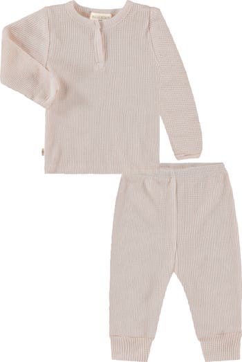 Warm thermal stitches keep baby feeling cozy in this stretchy set featuring a cute henley and matching sweatpants.