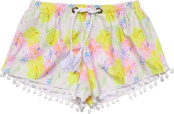 A drawstring waist offers a perfect fit in these playfully patterned swim shorts always ready for adventure.