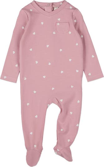 Here s the perfect everyday footie for your pint-size queen of hearts. It s crafted for cozy comfort with silky plant-based rayon and soft, breathable cotton. It has a jaunty tailored pocket and breathe-easy V-neck collar. And it s covered with dainty printed hearts for a charming feminine finish.