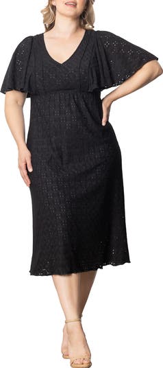 Airy embroidered eyelets sweeten a graceful midi dress fashioned with romantic flutter sleeves and an elastic Empire waist.