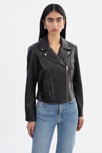 The Klea Recycled Leather Biker Jacket redefines a timeless classic with a modern edge. It features an asymmetric front zip, functional snaps at the collar and lapel, and sleek zip pockets. With its flattering fitted cut and clean lines, this jacket brings polish and edge to any look, perfect from day to night.