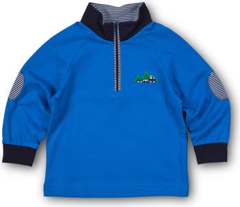 Sporty and playful, this shirt is crafted from soft blue jersey with navy raglan sleeves for a classic contrast. A cheerful appliqué train travels across the front, adding whimsical detail that little ones will love. A half-zip at the front makes dressing easy while giving it a polished, athletic look. Made from a cotton-spandex blend, it offers gentle stretch for comfort that lasts through school days, playdates, and picture-worthy moments. Blue jersey, 97% cotton 3% spandex, navy jersey, appliqué train, front zipper.