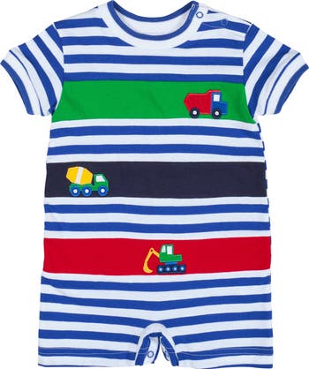 Perfect for playful days, this boys royal-and-white stripe shortall is crafted from soft cotton knit and decorated with appliqué trucks in bold navy, green, and red panels. Features shoulder and inseam snaps for easy dressing.