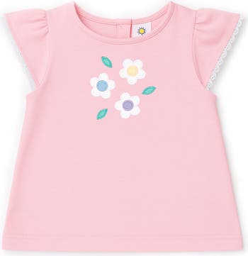 Sweet and sunny, this pink interlock knit top is crafted from soft 100% cotton for cool, all-day comfort. Appliqué flowers bloom across the front chest, adding cheerful color and playful charm. Flutter sleeves finished with crisp white trim create a light, breezy look, while a back neck button closure keeps dressing simple and polished. A bright warm-weather essential perfect for pairing with shorts, skirts, and days full of sunshine.