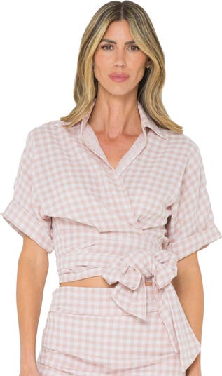 Crisp cotton blend Kora Top with wrap design, cuffed sleeves, and plunging neckline. Lightweight and flattering, made in India.