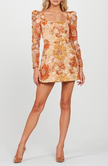 A glittering garden animates a totally toastable cocktail dress designed with a romantically squared neckline and cut to a leg-baring length.