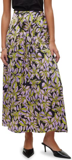 Delightful blooms romance this lightly draped skirt designed with a layered, asymmetric hem.