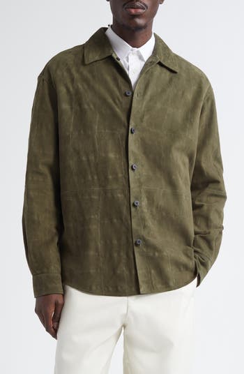 Italian goatskin suede is softly stamped with croc embossing on a button-up shirt cast in a khaki-inspired hue.