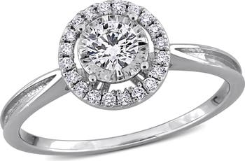 Show off your stylish flair by donning this marvelous halo ring. Featuring round-cut lab-grown diamonds crafted in 18k white gold. This stunning ring is enhanced with a high polish finish.