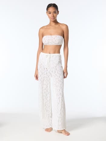 These lightweight and cool cover up pants make going from beach to street a breeze. An allover lace adds sultry sophistication to your sun style. Coordinate with matching lace swim styles or add this statement to a solid option.
