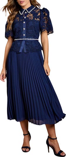 Exquisite lace bodice with elegant puff sleeves and delicate collar detail. Striking jewel button fastening through the front for a sophisticated finish. Defined waistline with decorative trim creating a flattering silhouette. Flowing pleated skirt with midi-length hem for graceful movement. Fully lined construction ensuring comfort and proper drape throughout the day. This stunning coast dress combines timeless elegance with contemporary design elements.