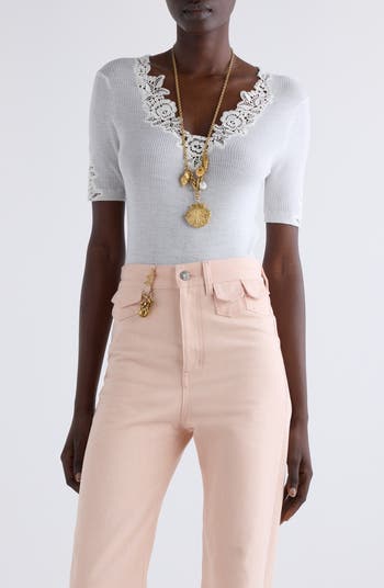 Delicate floral lace trim elevates this wardrobe-staple top cut from form-fitting wool rib.